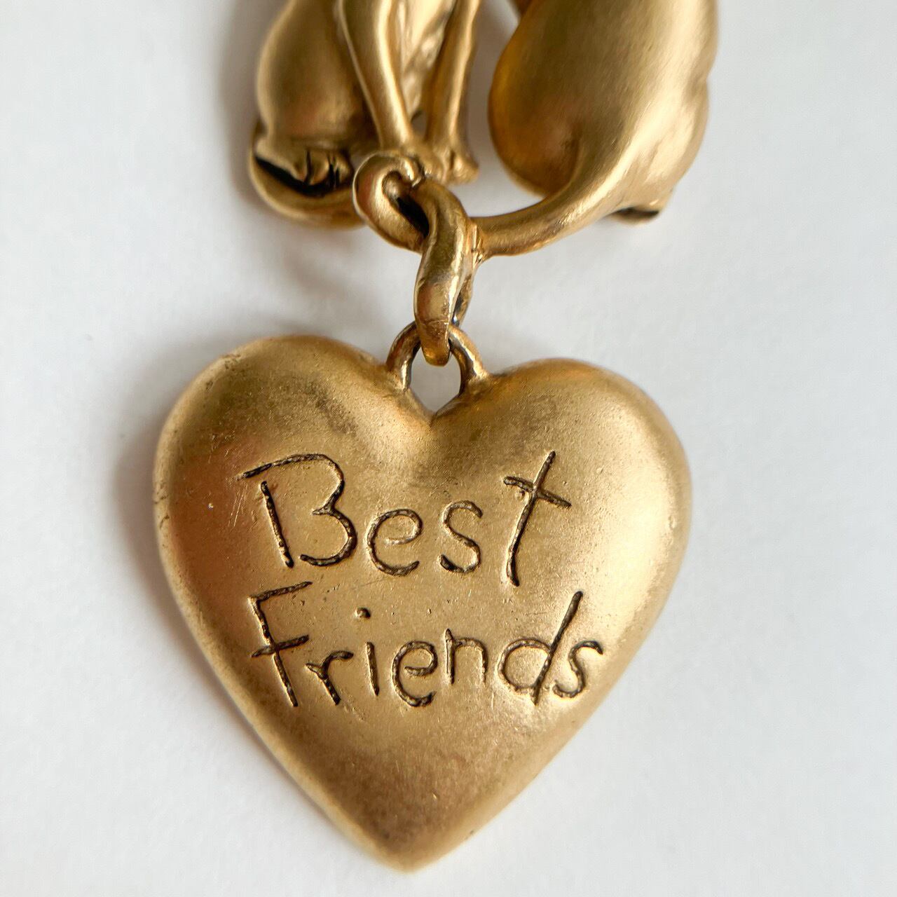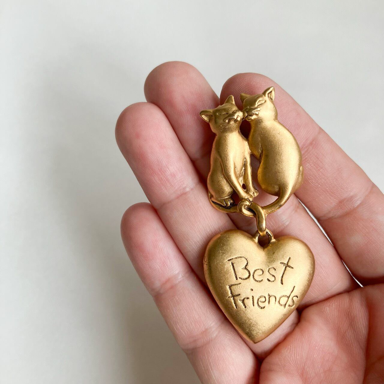 1934年にアメリカ、ロードアイランドで設立されたジュエリーメーカー"Dane craft"の、マットに加工された落ち着いたゴールドメタルの、2匹の猫と揺れる"Best Friends”と書かれたハートのデザインが、とても素敵なヴィンテージブローチです。