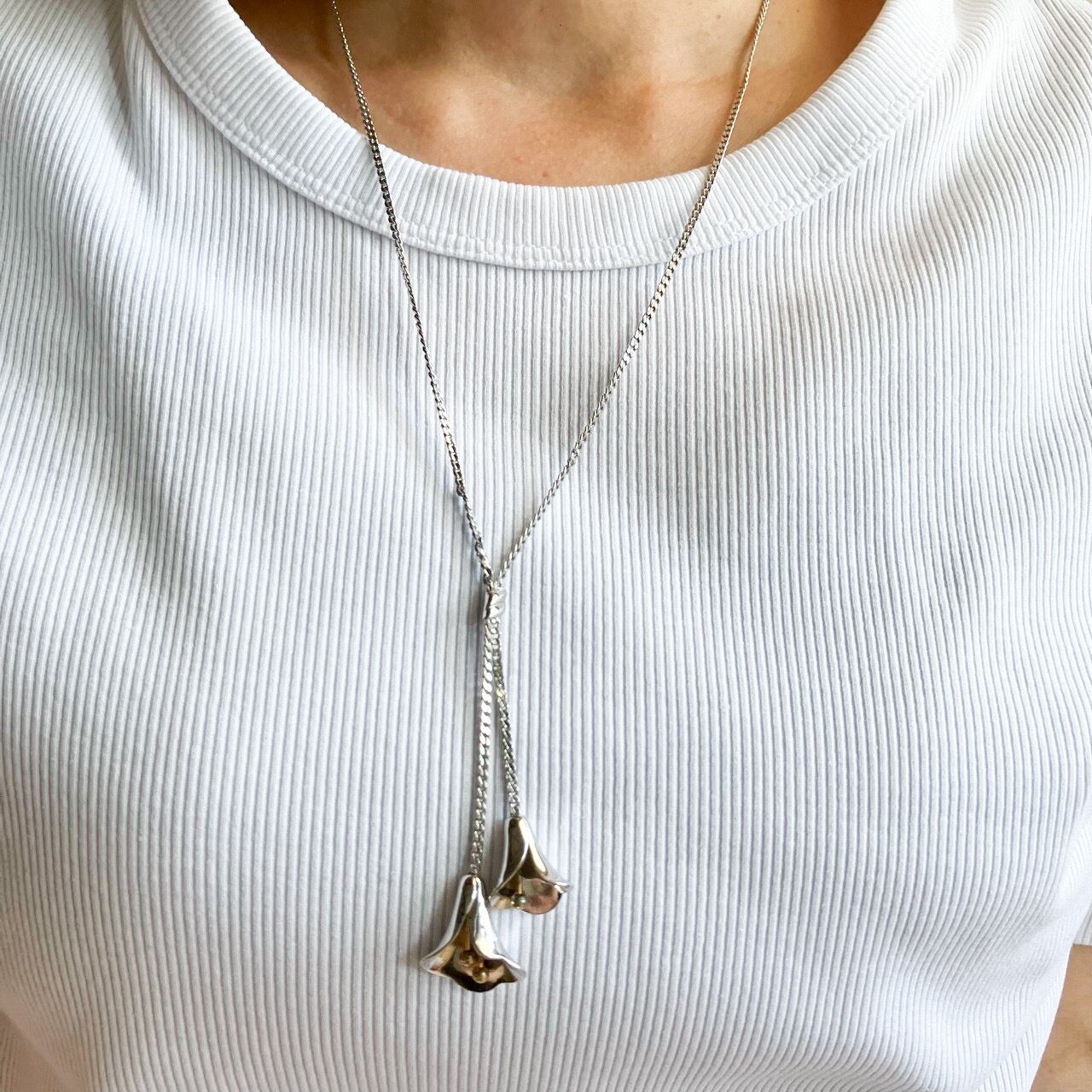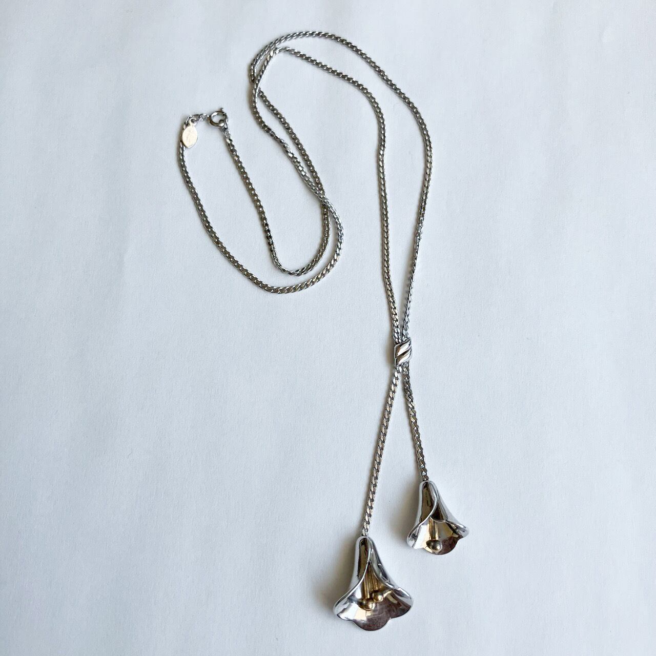 落ち着いたシルバーメタルにさりげないゴールドメタルのめしべが付いた立体的な2つのユリがチェーンで揺れるデザインが、とても素敵な”AVON”(エイボン)のヴィンテージネックレスです。