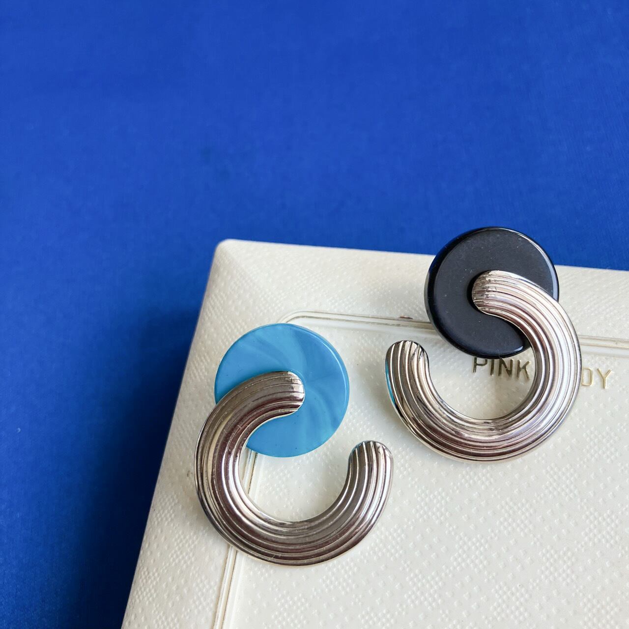シルバーメタルのデザインされたサークル型のトップに、ブルー、ブラック、ホワイトのプラスティックディスクパーツを自由に組み合わせて、雰囲気を変えて付けられる、モダンなオブジェのようなデザインが、とても素敵な”AVON”(エイボン)のヴィンテージピアスです。