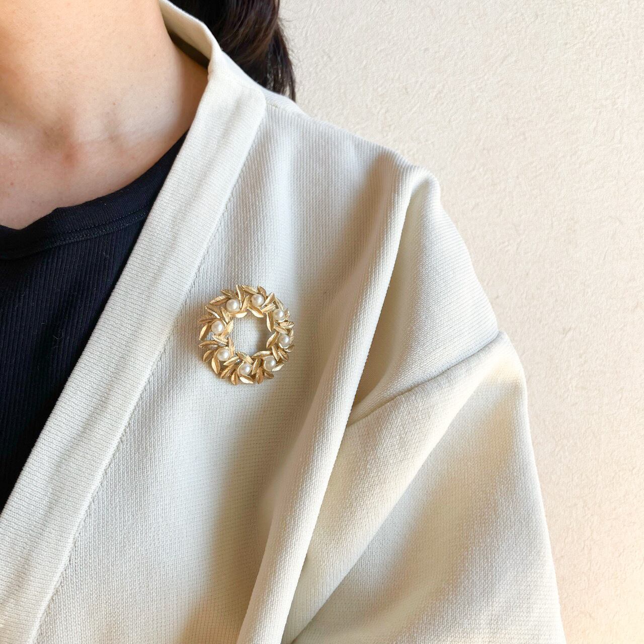 加工されたゴールドメタルのリーフにパールビーズで飾られた、上品なリースのデザインがとても素敵な”AVON”(エイボン)のヴィンテージブローチです。