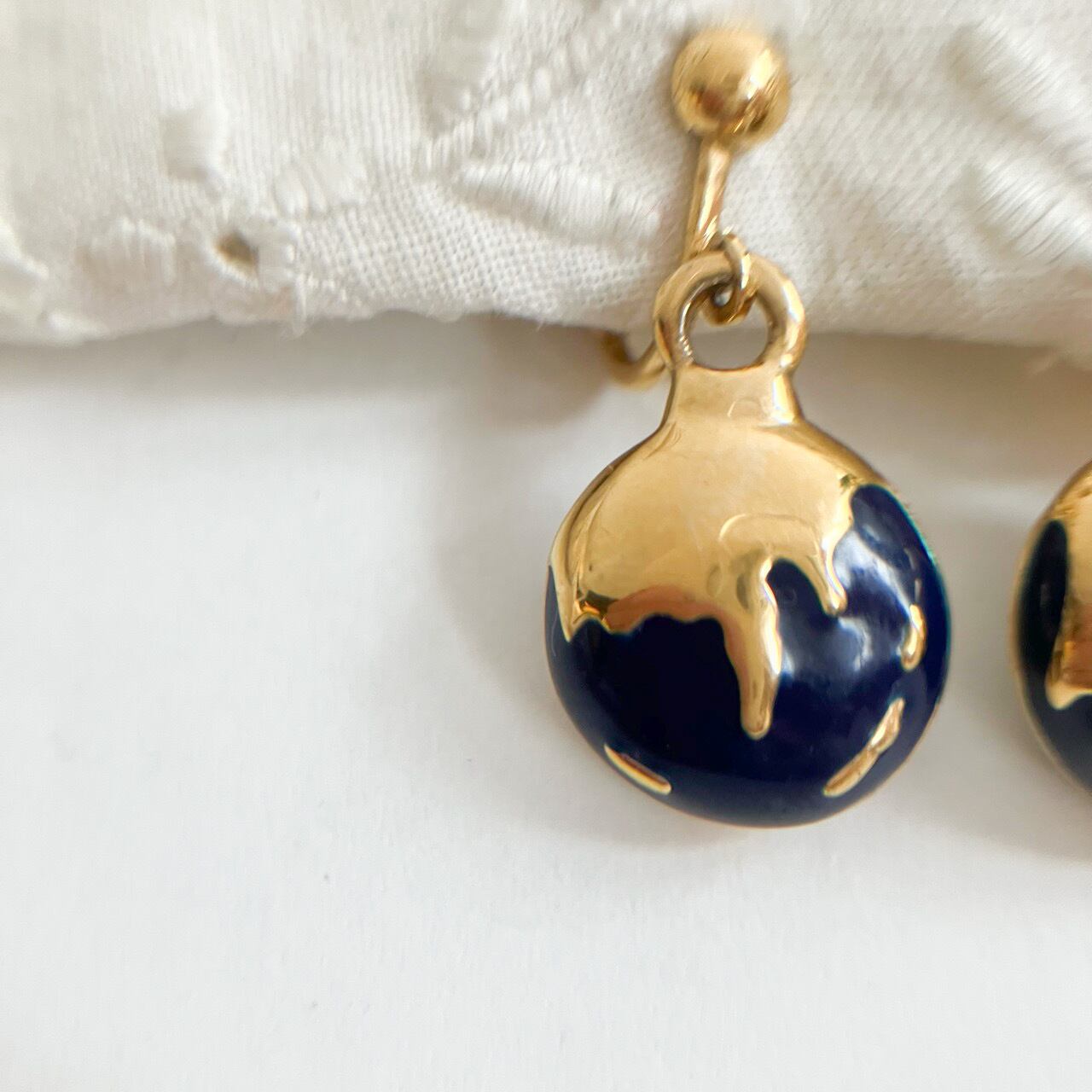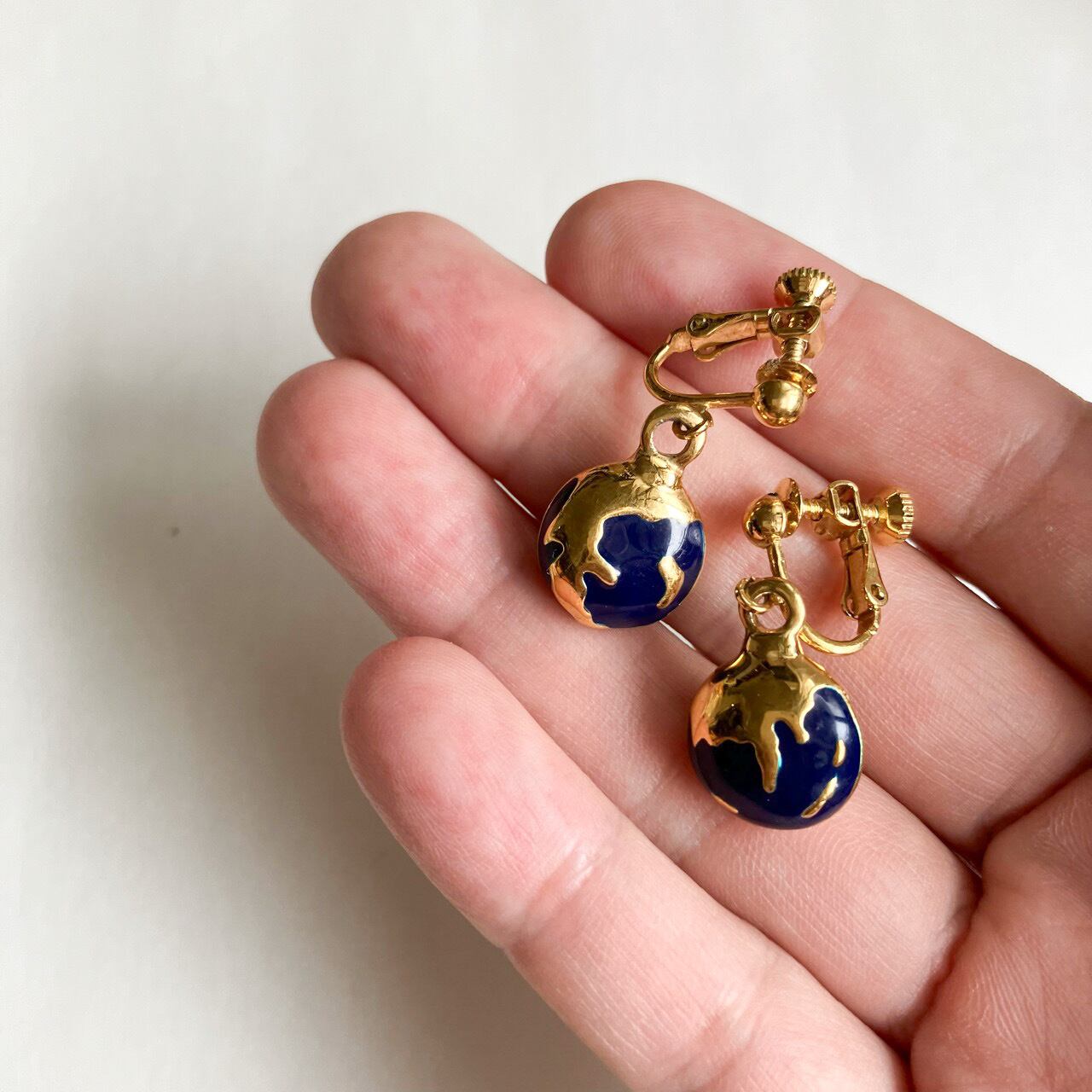 ゴールドメタル&ダークブルーエナメルのユニークな地球のパーツが揺れるデザインが、とても素敵なヴィンテージイヤリングです。