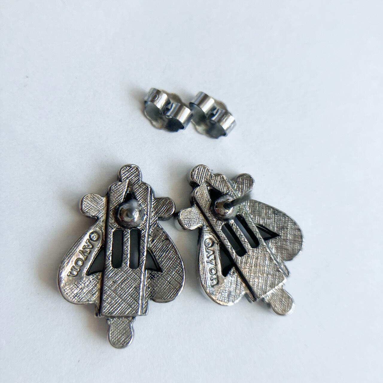 アンティーク調の落ち着いたシルバーメタルにマーカサイト風で、クラシカルな美しいハープがデザインされた、とても素敵な”AVON”(エイボン)のヴィンテージピアスです。
