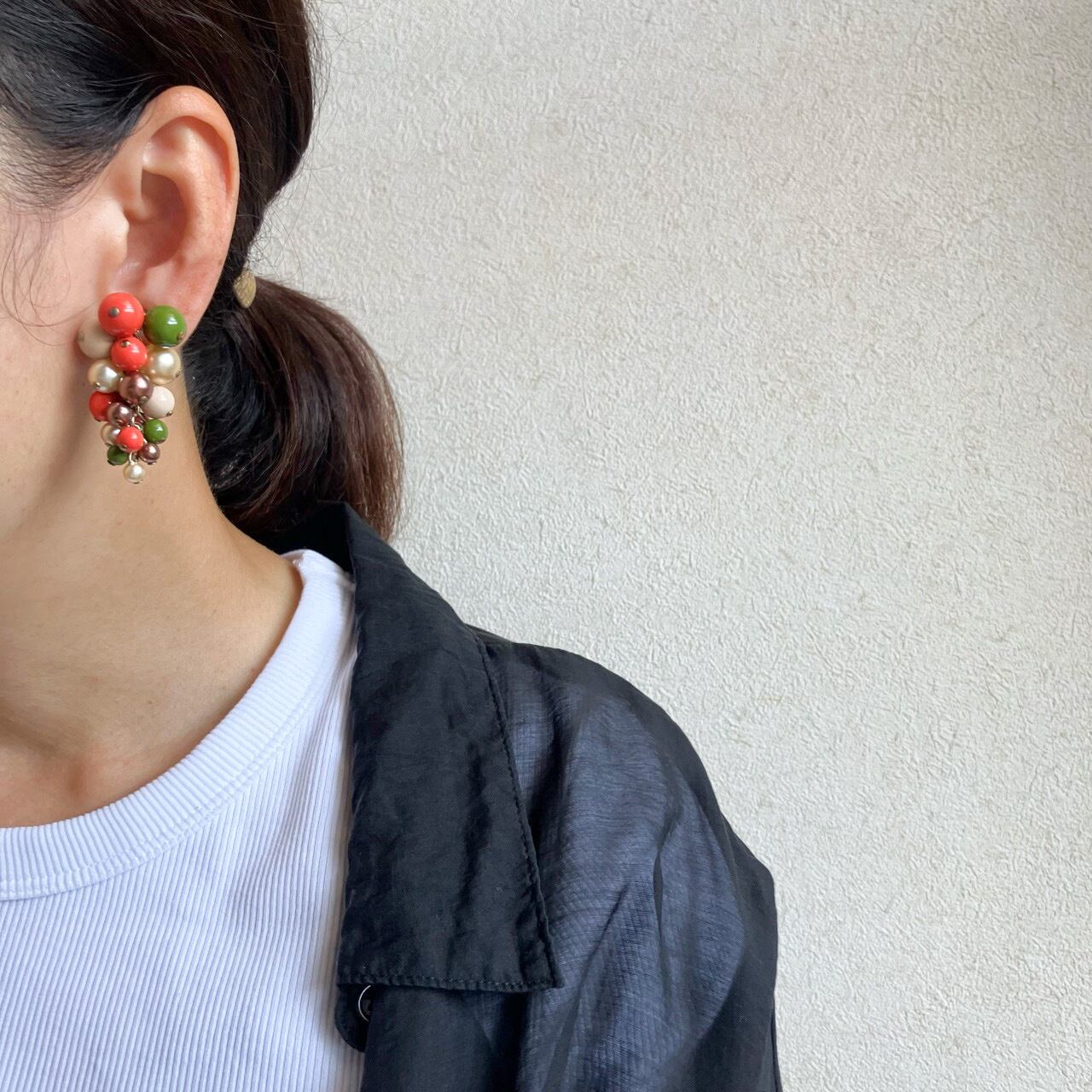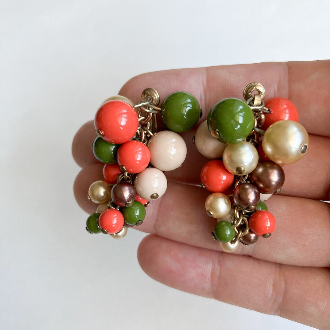 落ち着いたオレンジ、グリーン、クリーム、ブラウン、パールなどのオータムカラービーズが房になって揺れる、お洒落なボリューム感のあるデザインがとても素敵なヴィンテージイヤリングです。