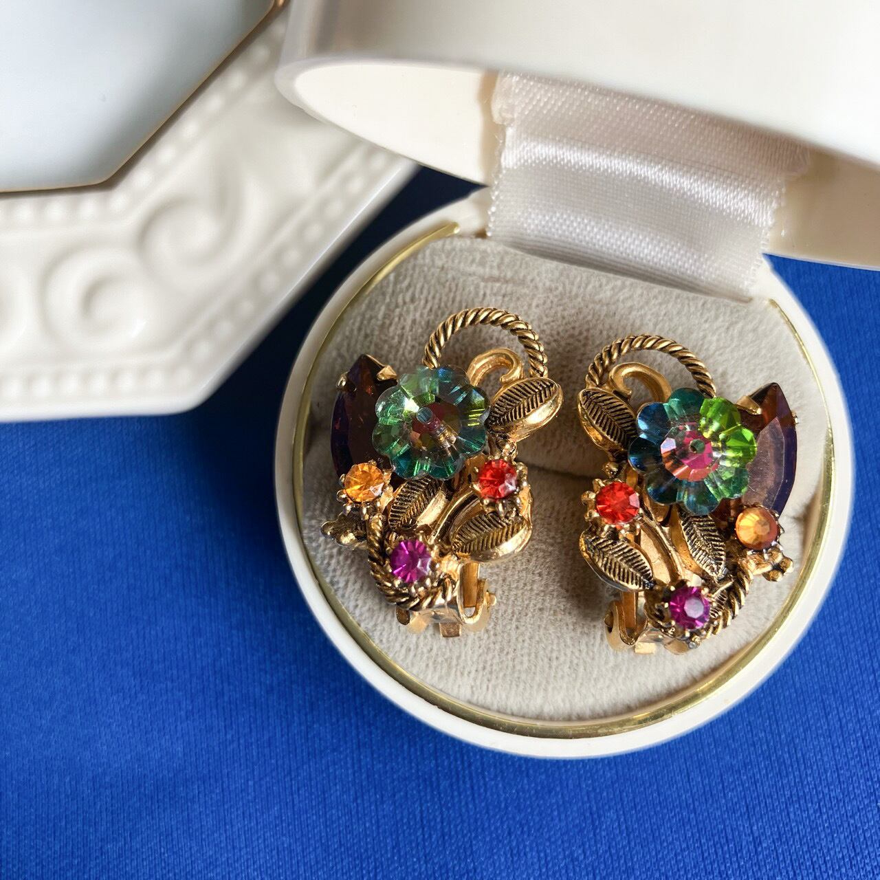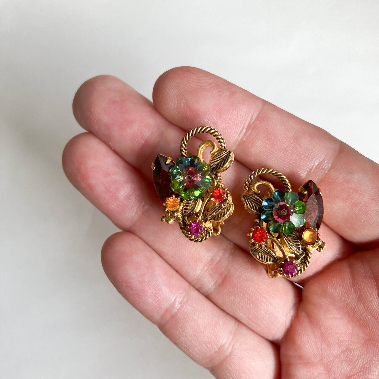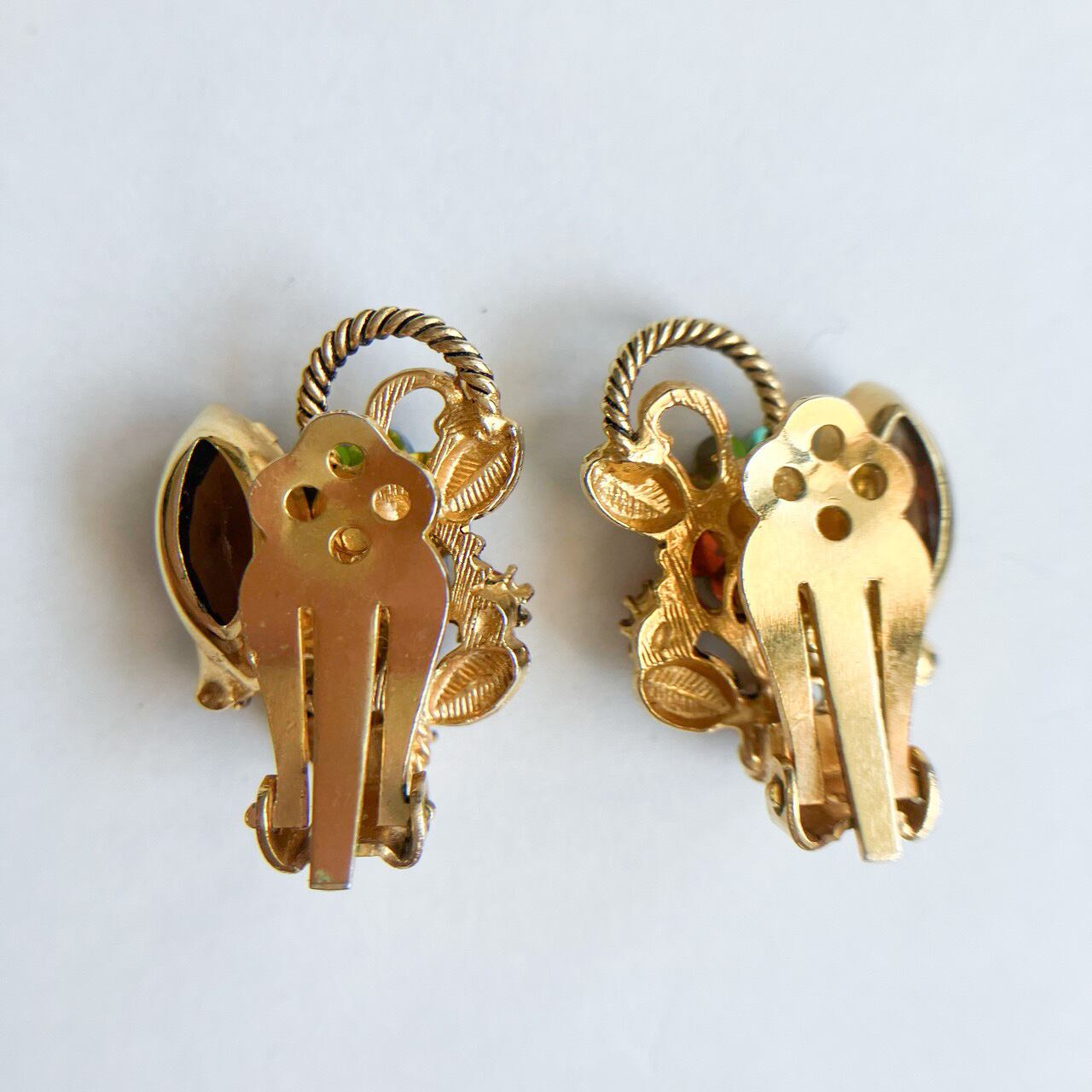 落ち着いたアンティーク調ゴールドメタルのリーフがデザインされた土台に、ウォーターメロンのお花パーツ、ブラウン、オレンジ、イエロー、ピンクパープルのラインストーンで飾られた、とても素敵なヴィンテージイヤリングです。