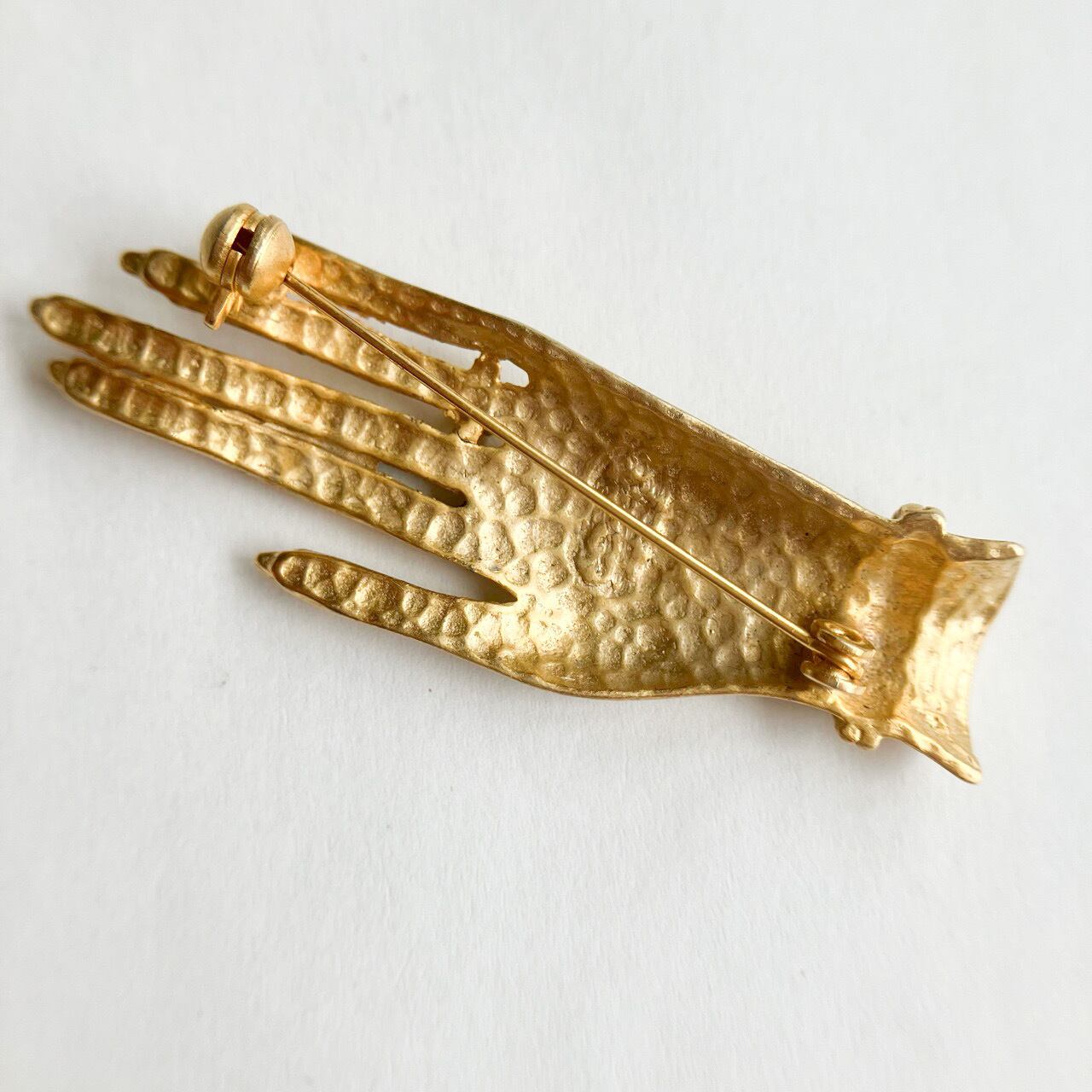 小粒のクリアラインストーンの指輪を付けた、マットなゴールドメタルの美しい女性の手のデザインが、とても素敵なヴィンテージブローチです。