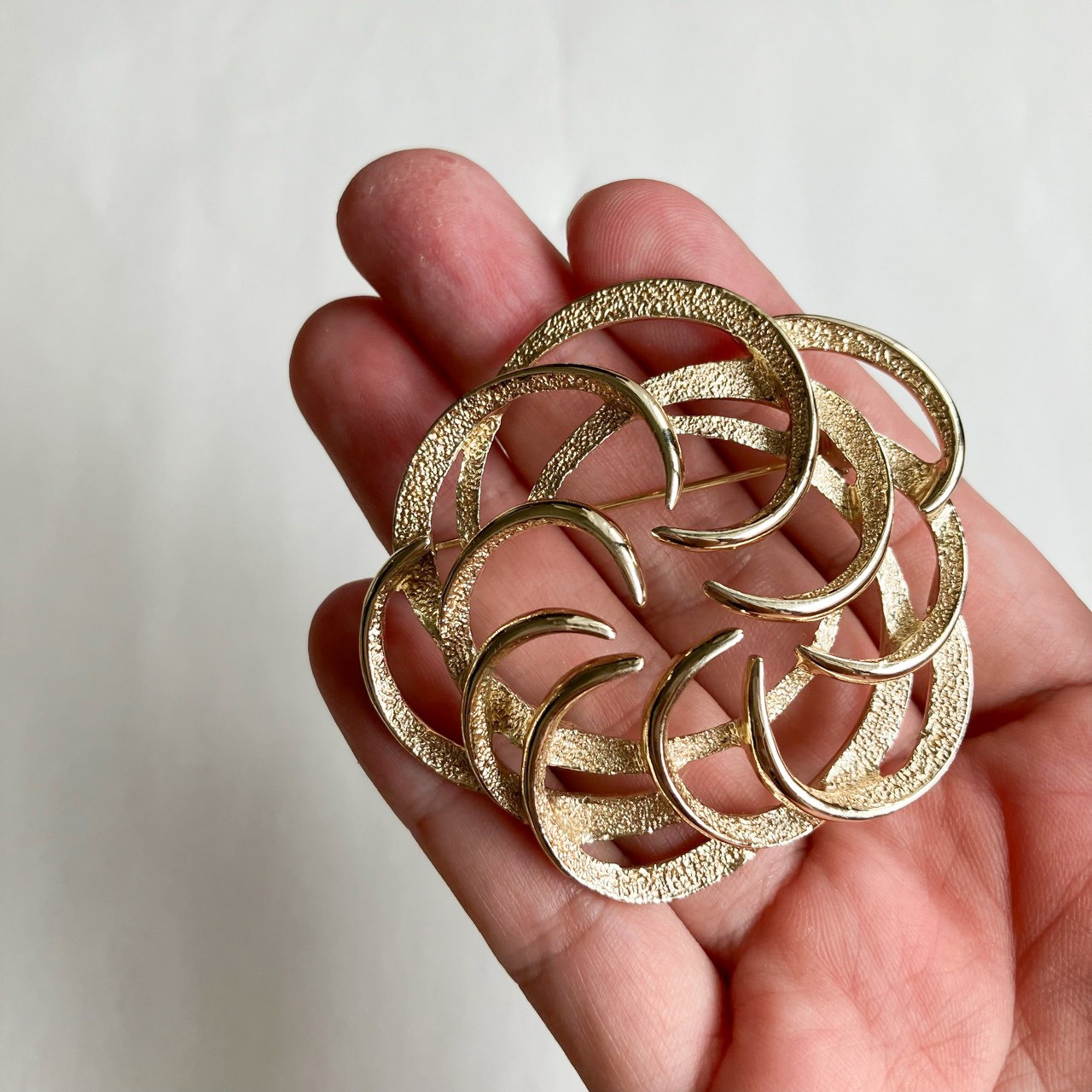 1949年に設立されたジュエリーメーカー”Sarah Coventry”(サラコベントリー )の、艶と加工のゴールドメタルの渦巻きのようなモダンなデザインが、とても素敵なヴィンテージブローチです。