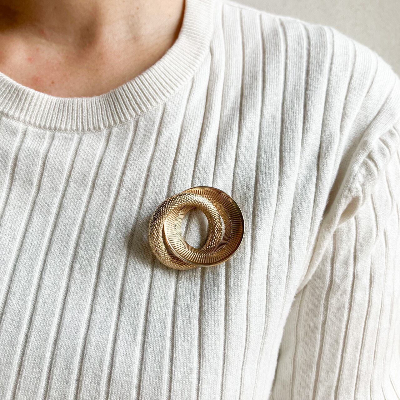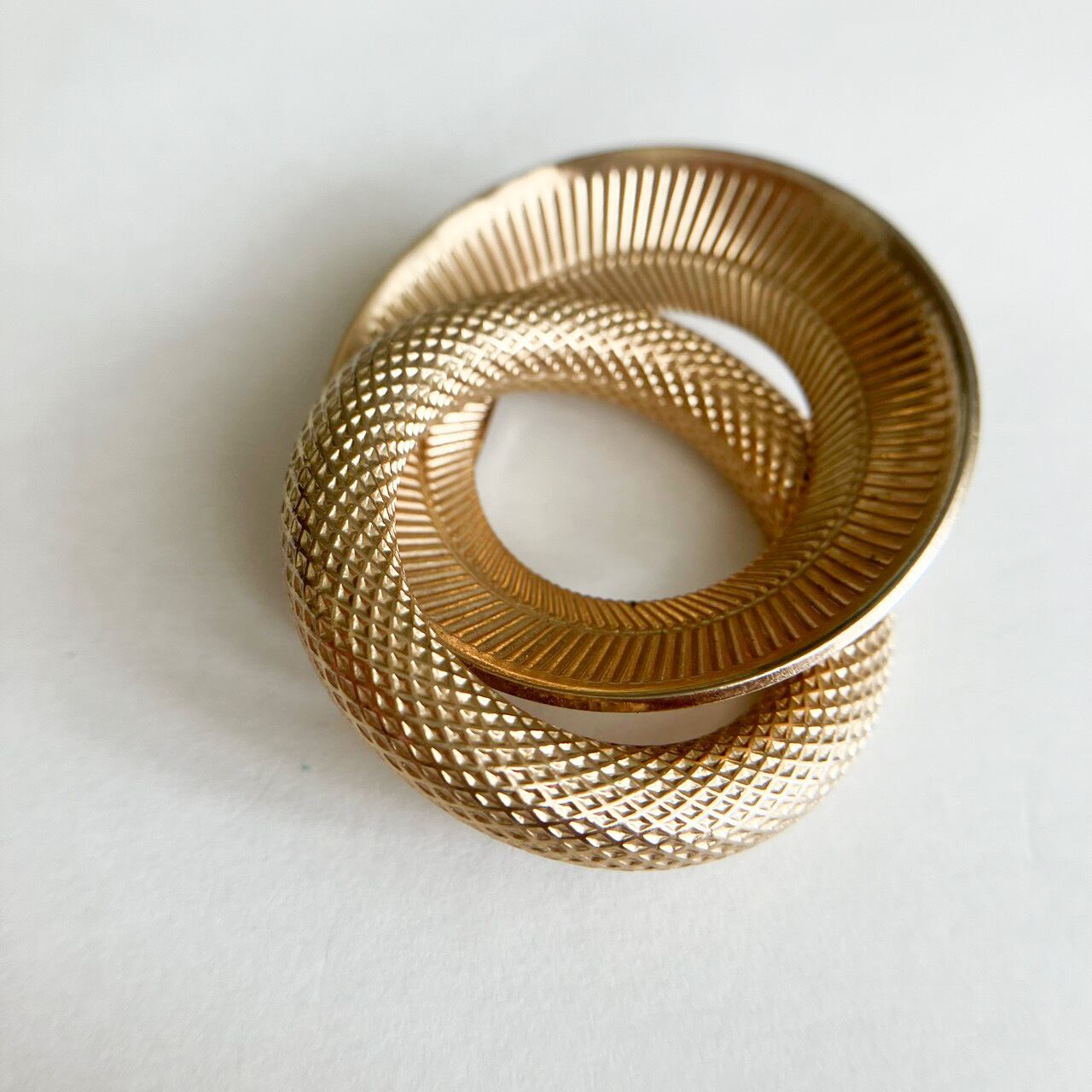 落ち着いたゴールドメタルのそれぞれ違う加工がされた2つの輪が重なった、モダンなオブジェのようなデザインがとても素敵なヴィンテージブローチです。