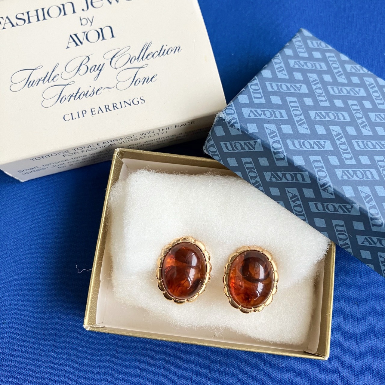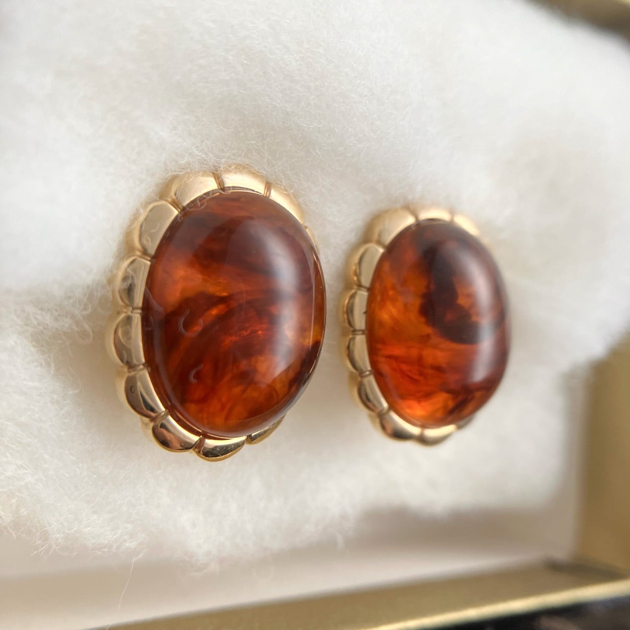 ゴールドメタルのデザインされた土台に、べっ甲風の立体的なプラスティックカボションがセットされたデザインが、とても素敵な”AVON”(エイボン)のヴィンテージイヤリングです。