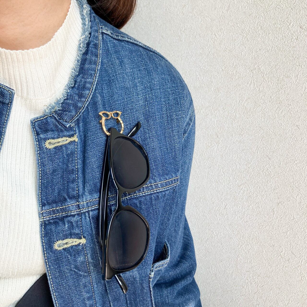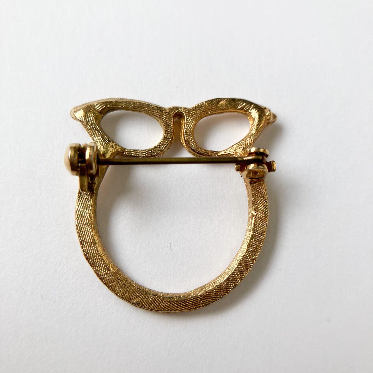 ゴールドメタルのシンプルな小さめメガネの遊び心のあるデザインがさりげなくお洒落なブローチです。