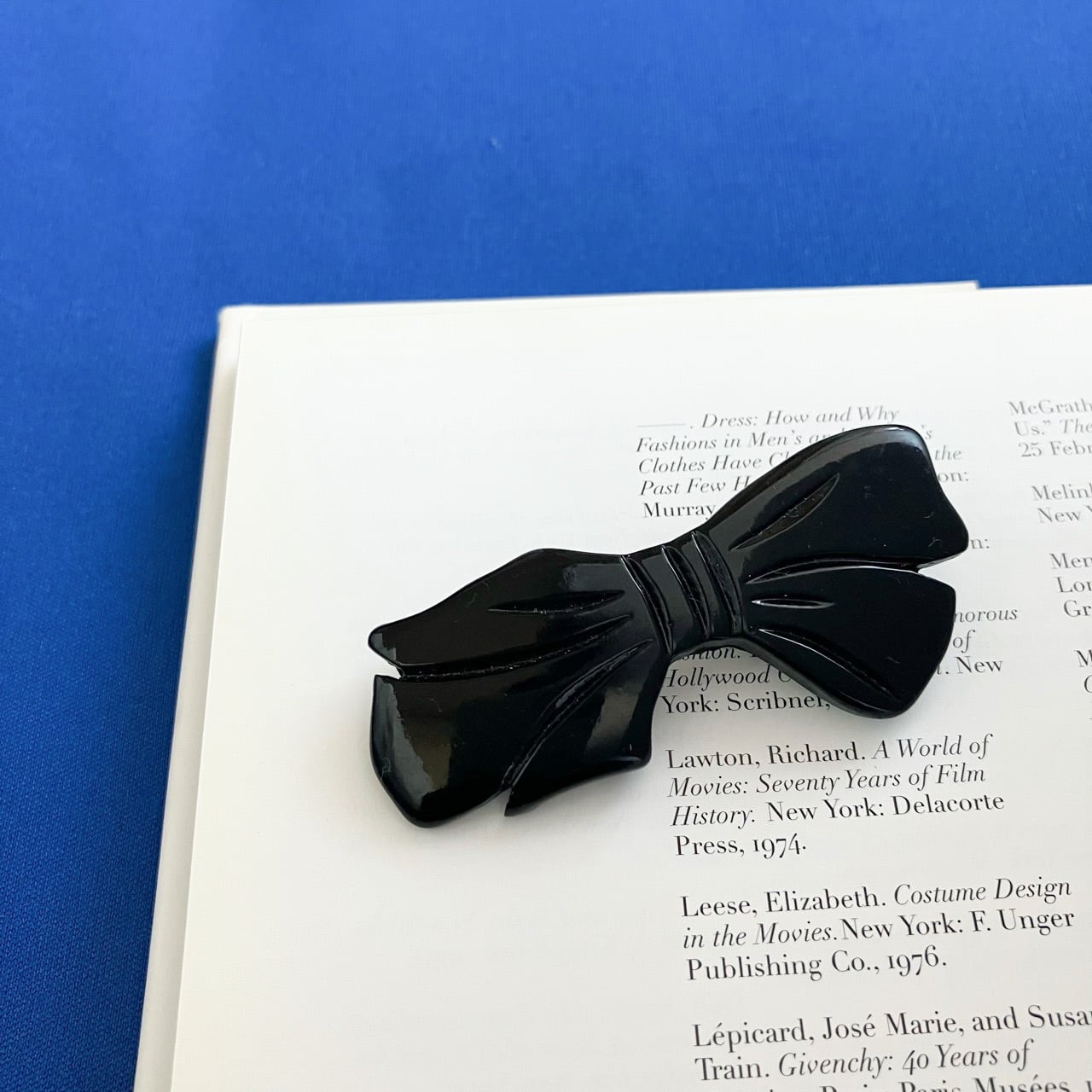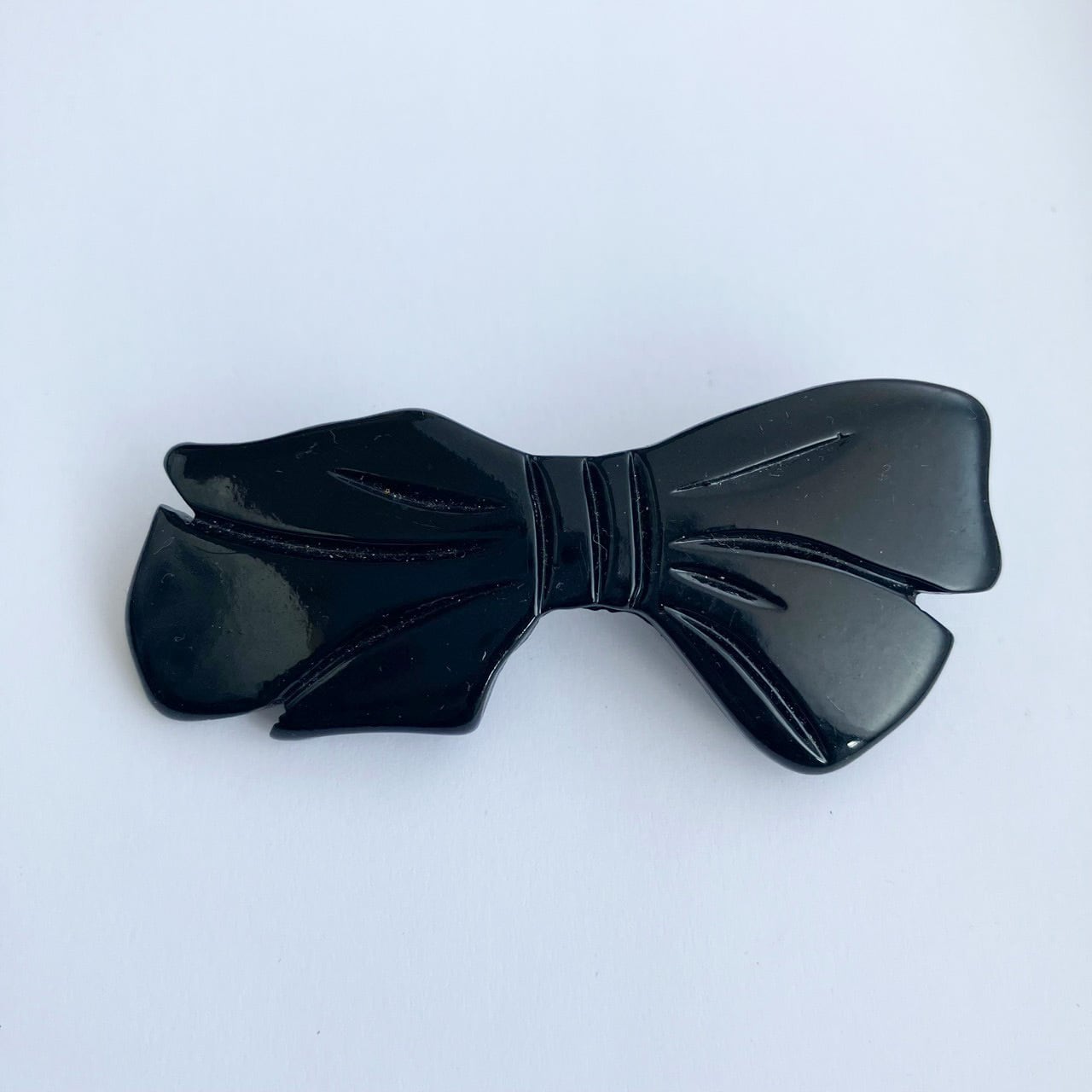 シックなブラックプラスティックに彫り柄のデザインが素敵な、甘すぎない上品なリボンのヴィンテージブローチです。