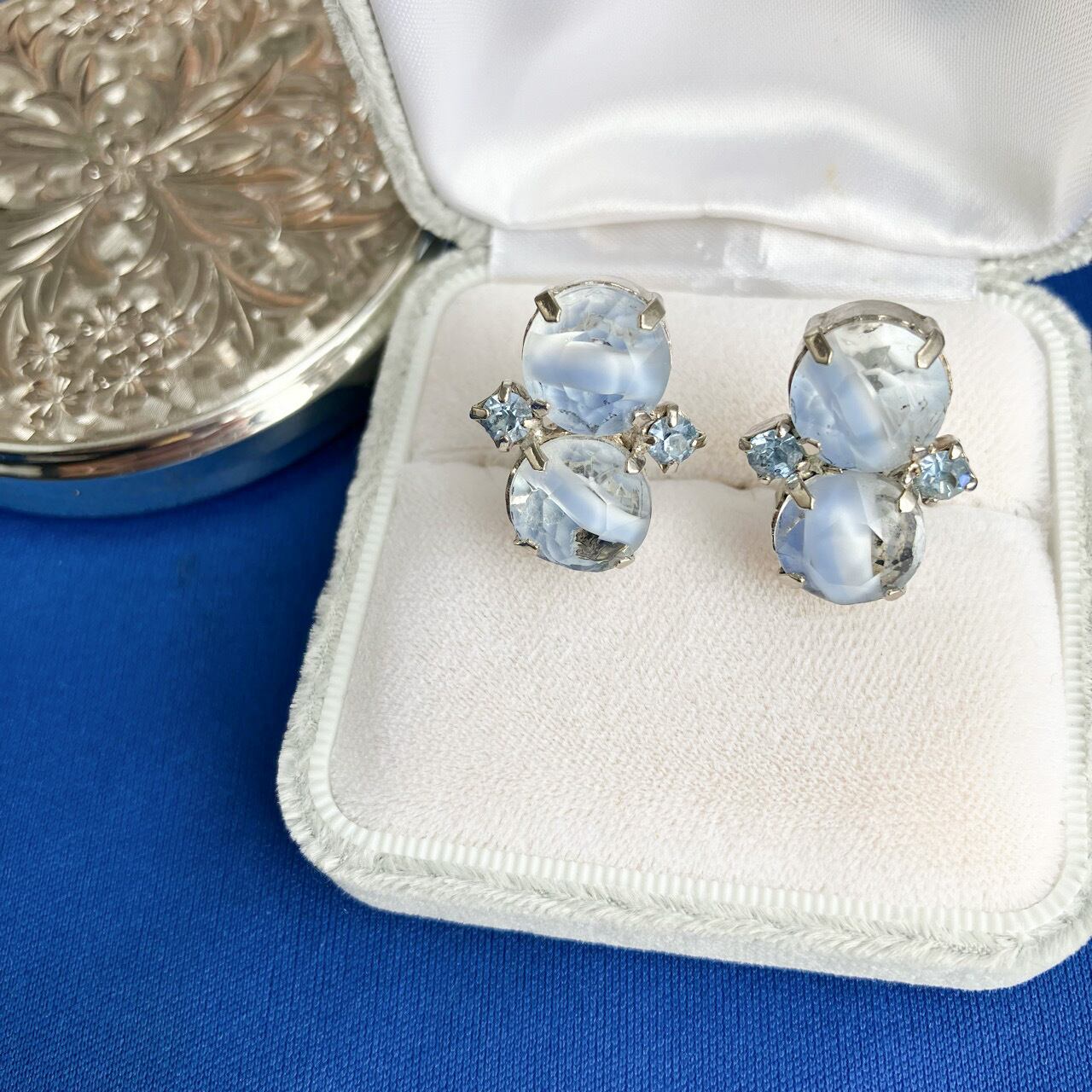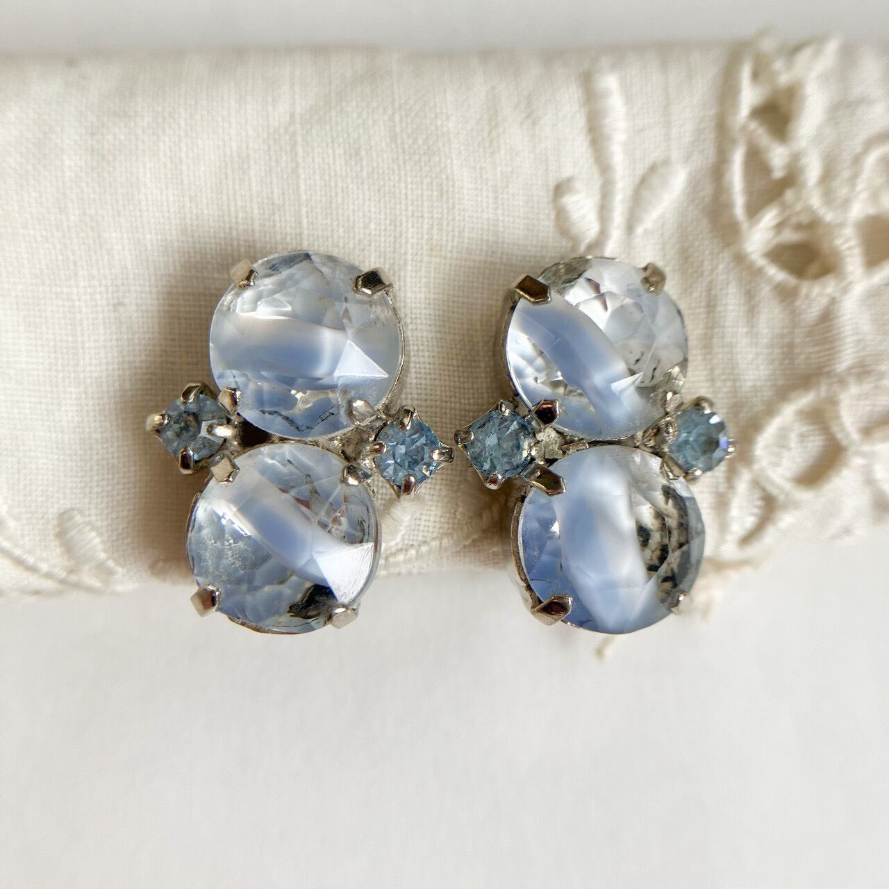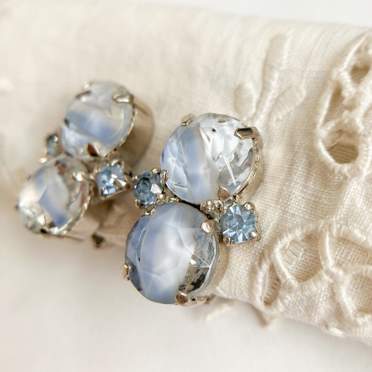 シルバーメタルの立体的な土台に、クリア&ライトブルーのきれいなパーツと小粒のラインストーンがセットされた、とても素敵なヴィンテージイヤリングです。