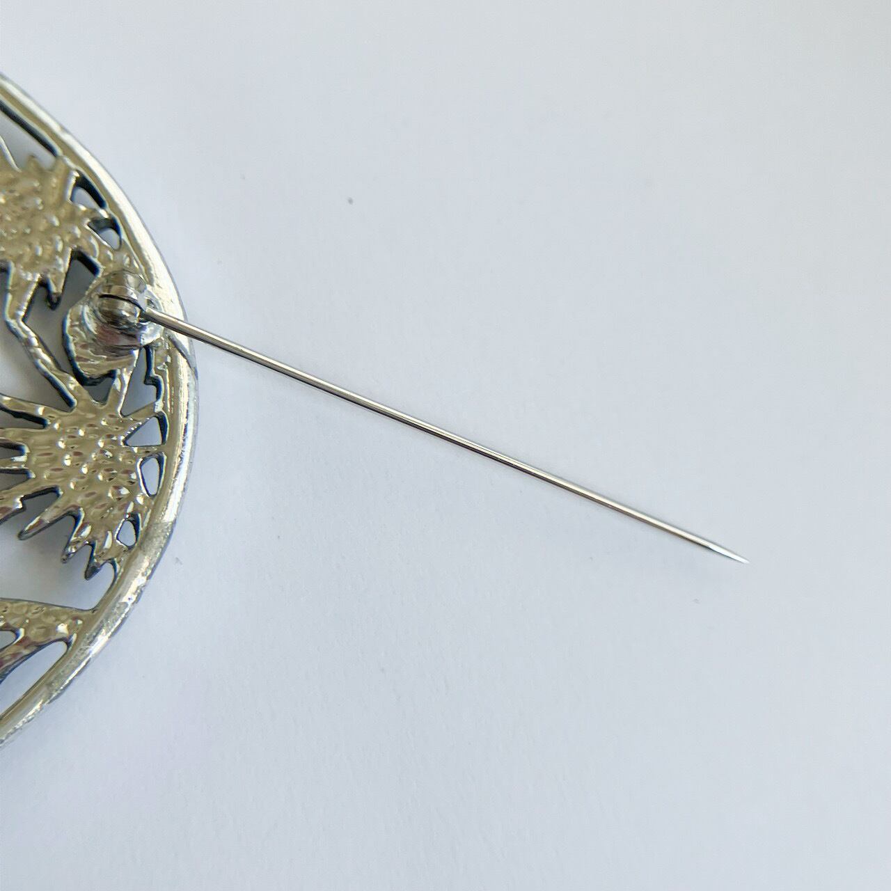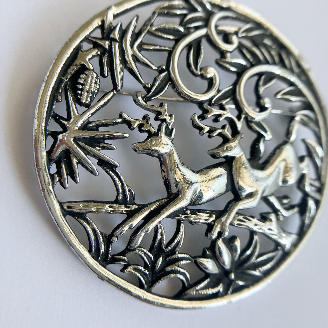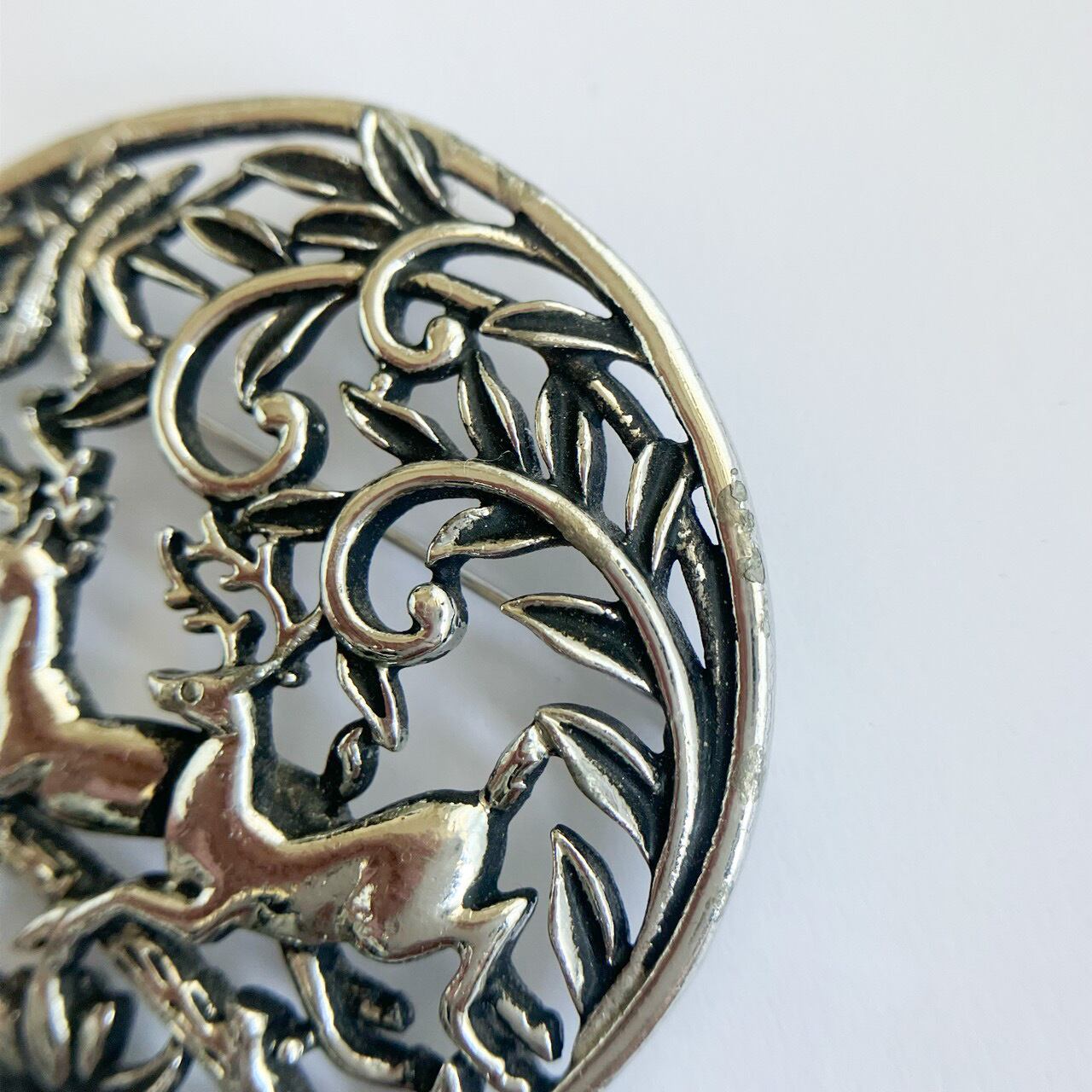 1949年に設立されたジュエリーメーカー”Sarah Coventry”(サラコベントリー)の、シルバーメタルの透かし柄の、森の中を走る2頭の鹿のデザインがとても素敵なヴィンテージブローチです。