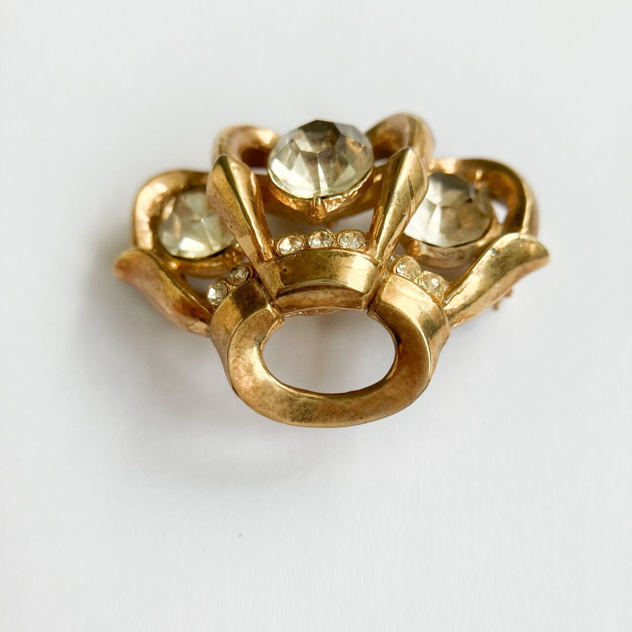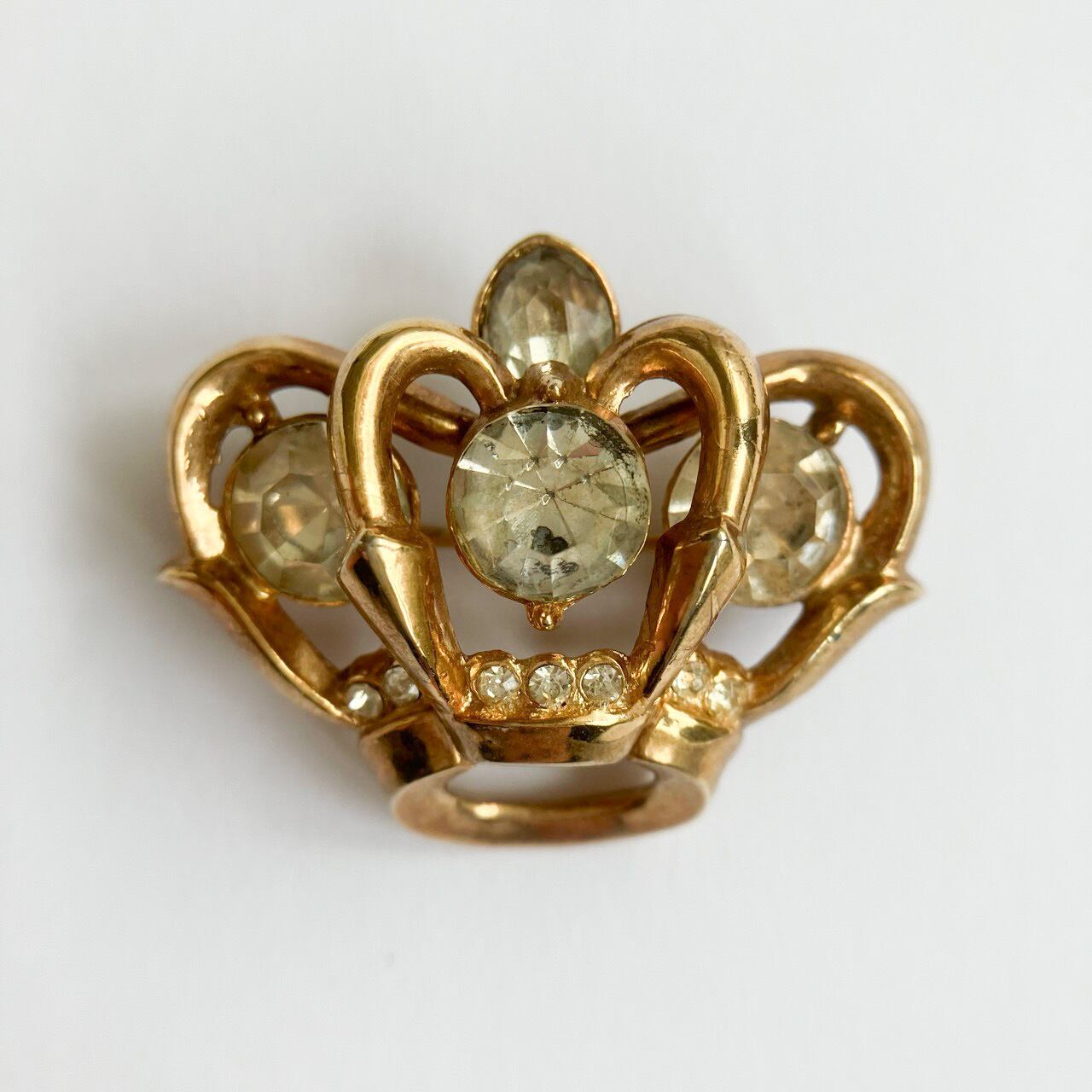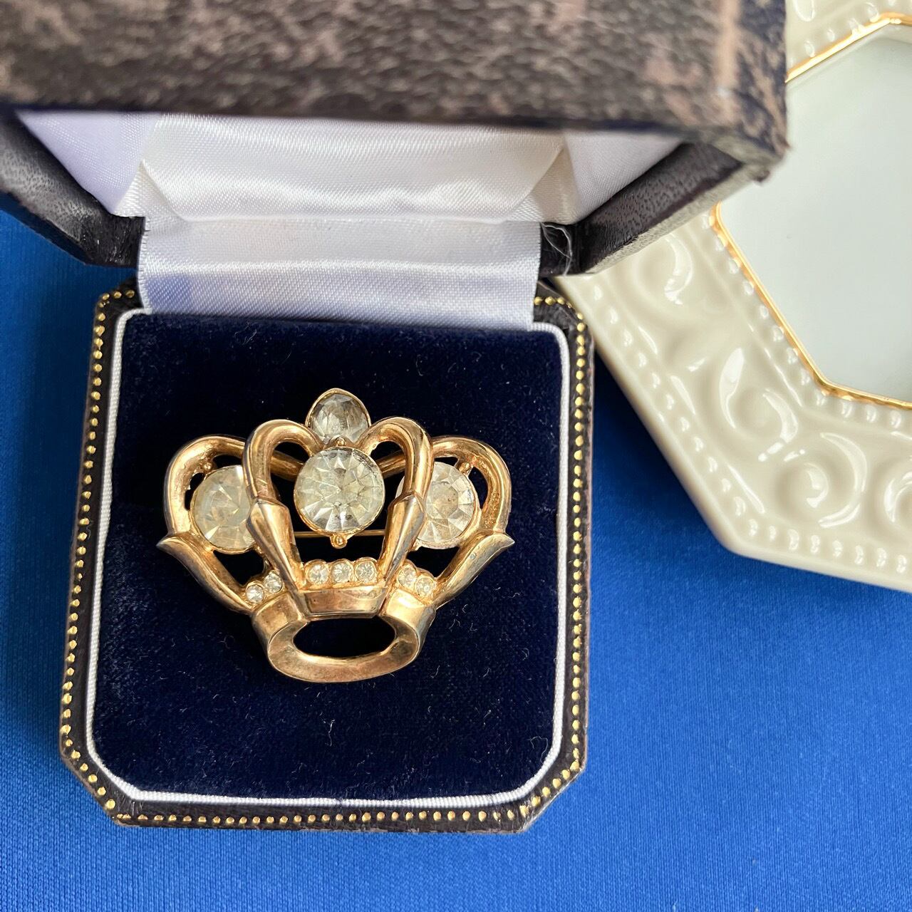 ゴールドメタルにクリアラインストーンで飾られた、クラシカルなクラウン(王冠)のデザインが、とても素敵なヴィンテージブローチです。