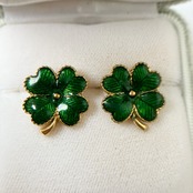 ゴールドメタルに落ち着いたグリーンエナメルで、ラッキーモチーフの四葉のクローバーがデザインされた、とても素敵な”AVON”(エイボン)のヴィンテージピアスです。