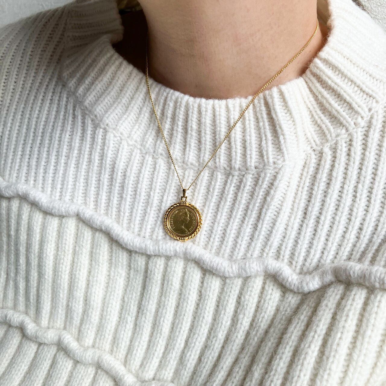美しいロープのようにデザインされたフレームがついた、とても素敵なヴィンテージのエリザベスコインネックレスです。
