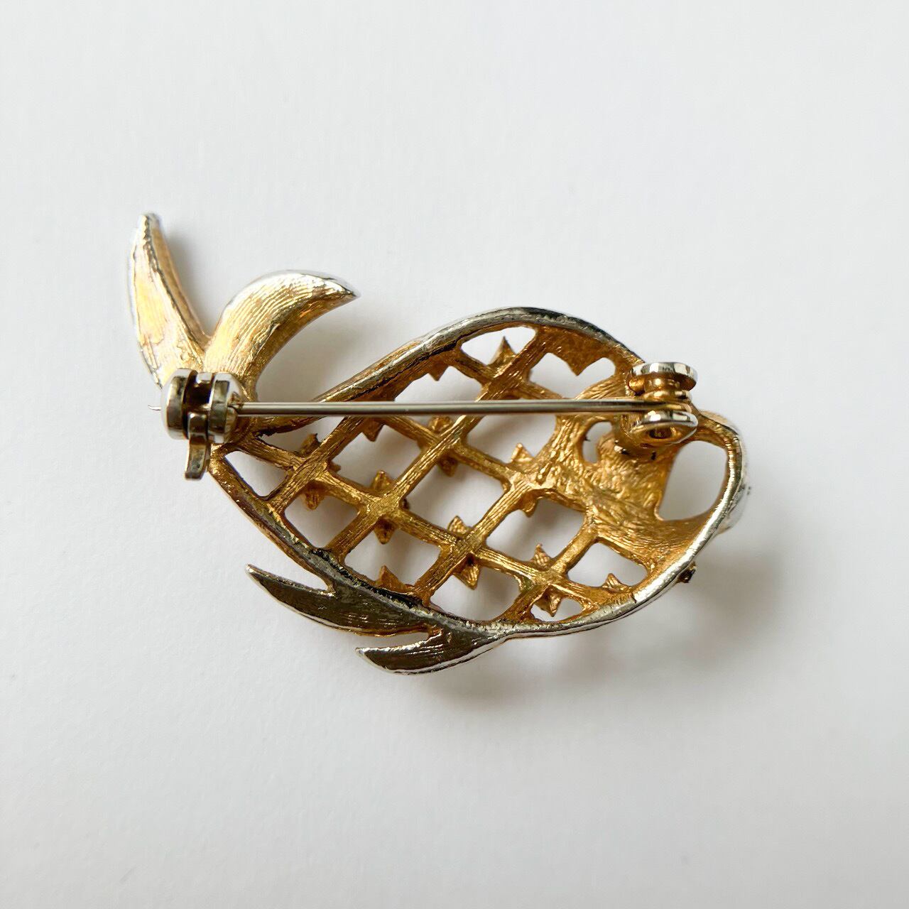 ゴールドメタルとクリアラインストーンのユニークなお魚のデザインが、とても素敵なヴィンテージブローチです。