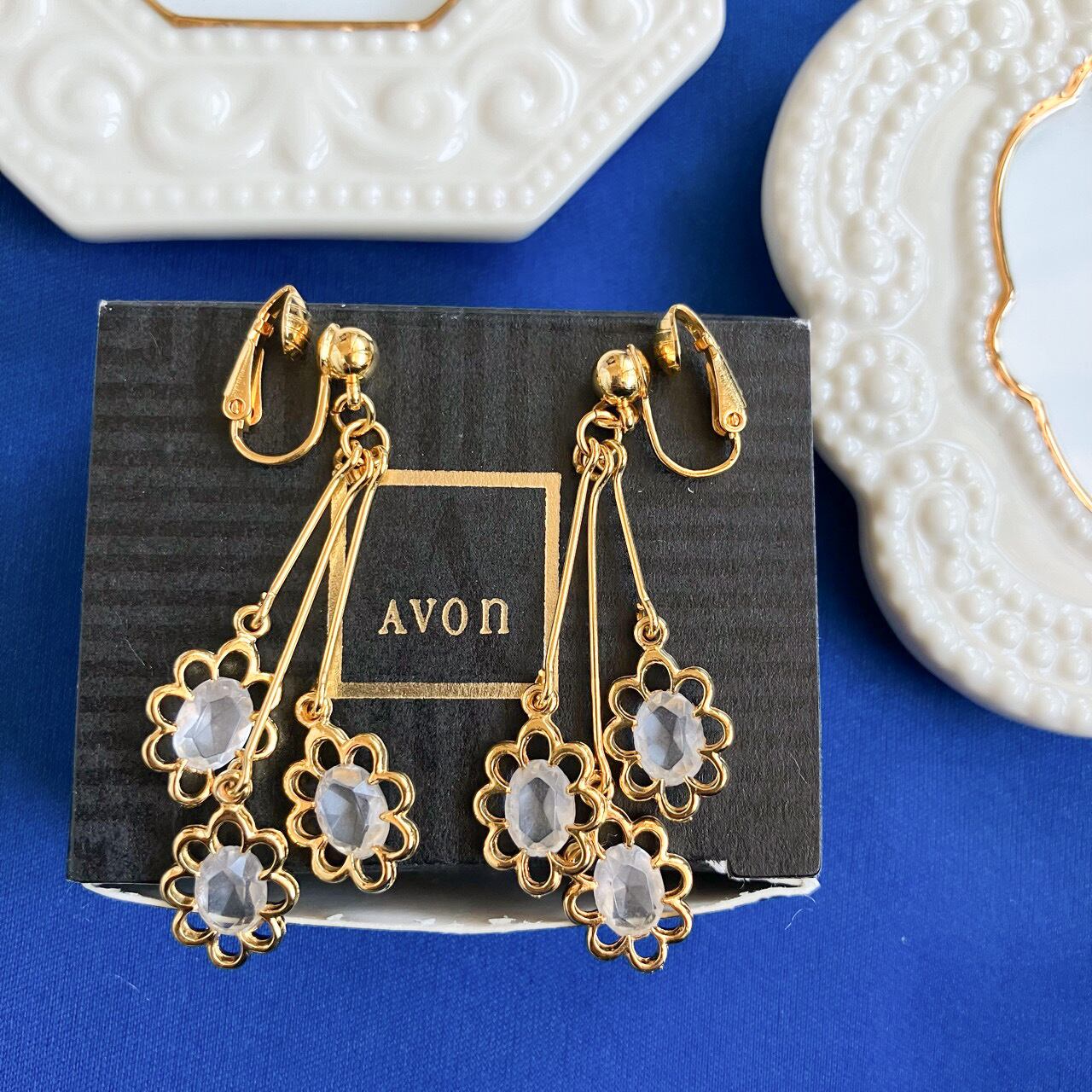 少し曇ったような落ちついた雰囲気のクリアパーツがアクセントになった3つのゴールドメタルフラワーがワイヤーで揺れる、キュートでお洒落なデザインがとても素敵な”AVON”(エイボン)のヴィンテージイヤリングです。