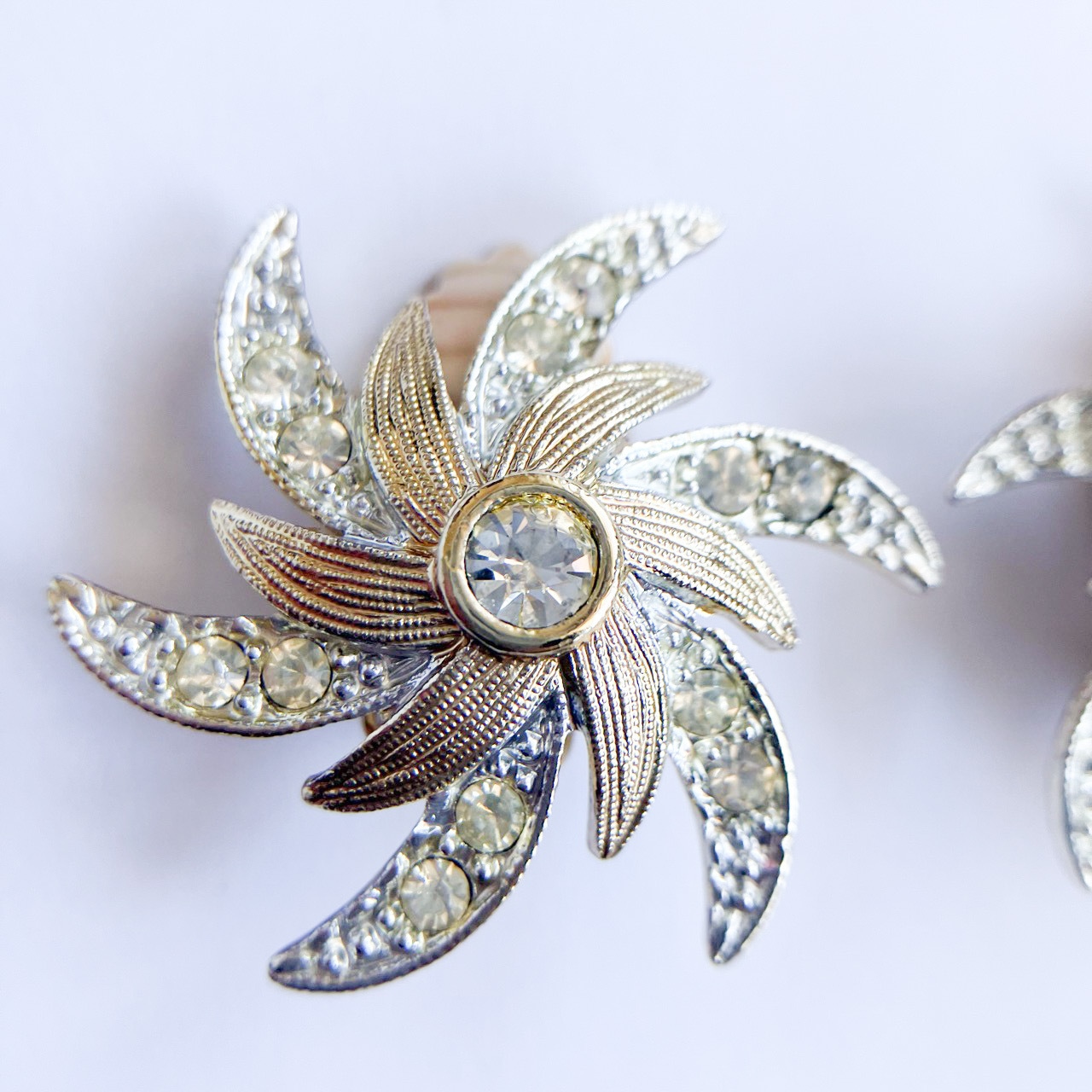 1949年に設立されたジュエリーメーカー”Sarah Coventry”(サラコベントリー )の、明るいゴールドメタルとクリアラインストーンのスターバーストのようなとても当時らしいデザインが、とても素敵なイヤリングです。