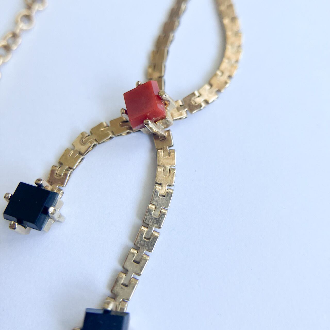 1949年に設立されたジュエリーメーカー”Sarah Coventry”(サラコベントリー )の、落ち着いたトーンのゴールドメタルチェーンにマットなレッド&ブラックのスクエアパーツがアクセントになったモダンで洗練されたデザインが、とても素敵なヴィンテージネックレスです。