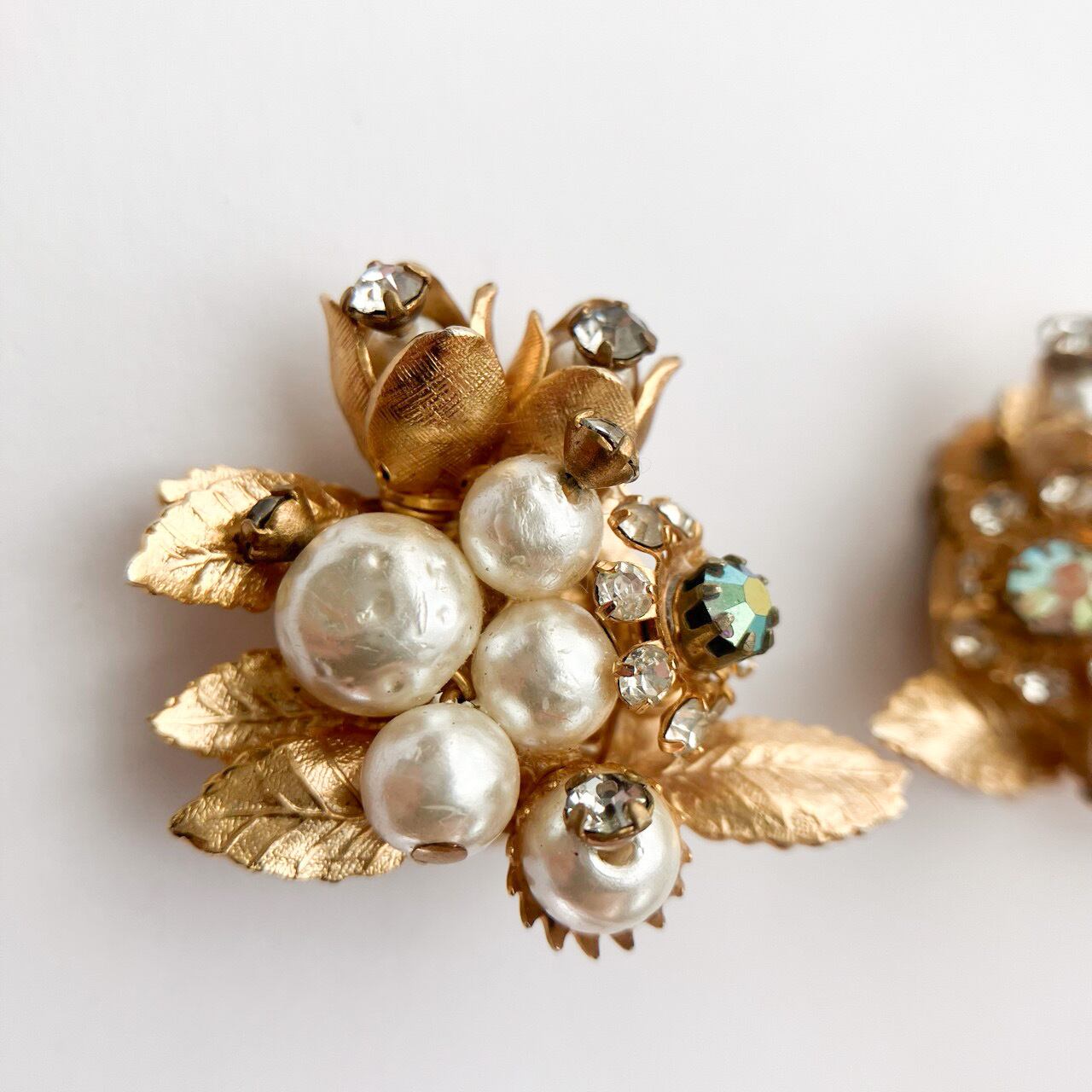 gold & pearl rhinestone flower leaf earring[e-2051] ヴィンテージイヤリング