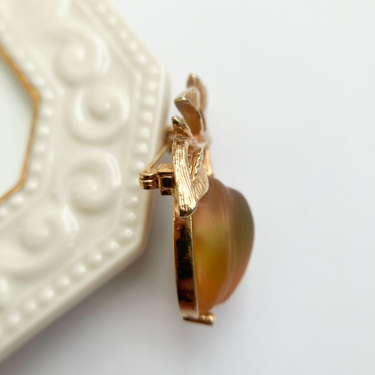 1949年に設立されたジュエリーメーカー”Sarah Coventry”(サラコベントリー )の、シャンパン色に薄らとピンクとグリーンが見えるような、独特の質感の半透明のぷっくりとした林檎がデザインされたとても素敵なブローチです。