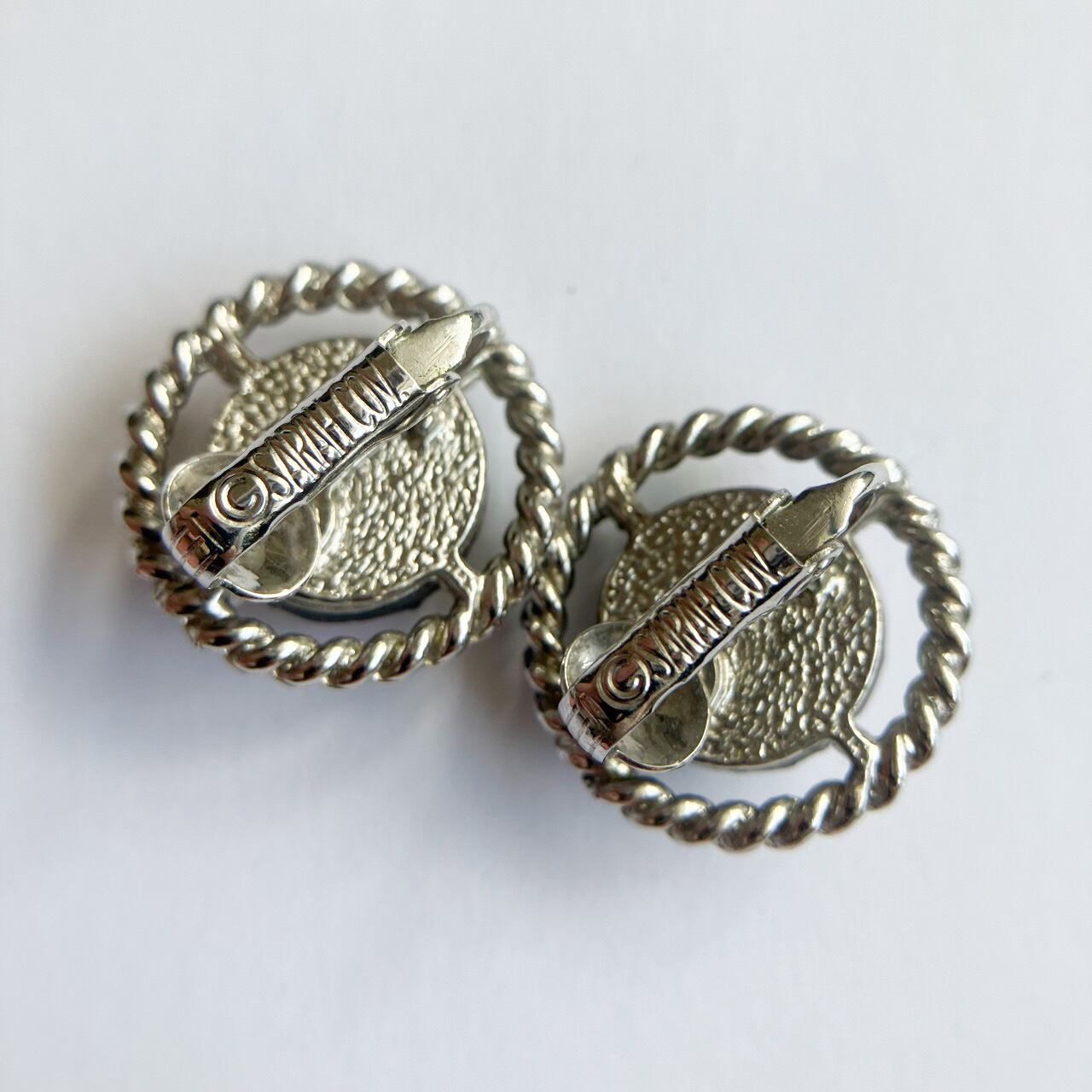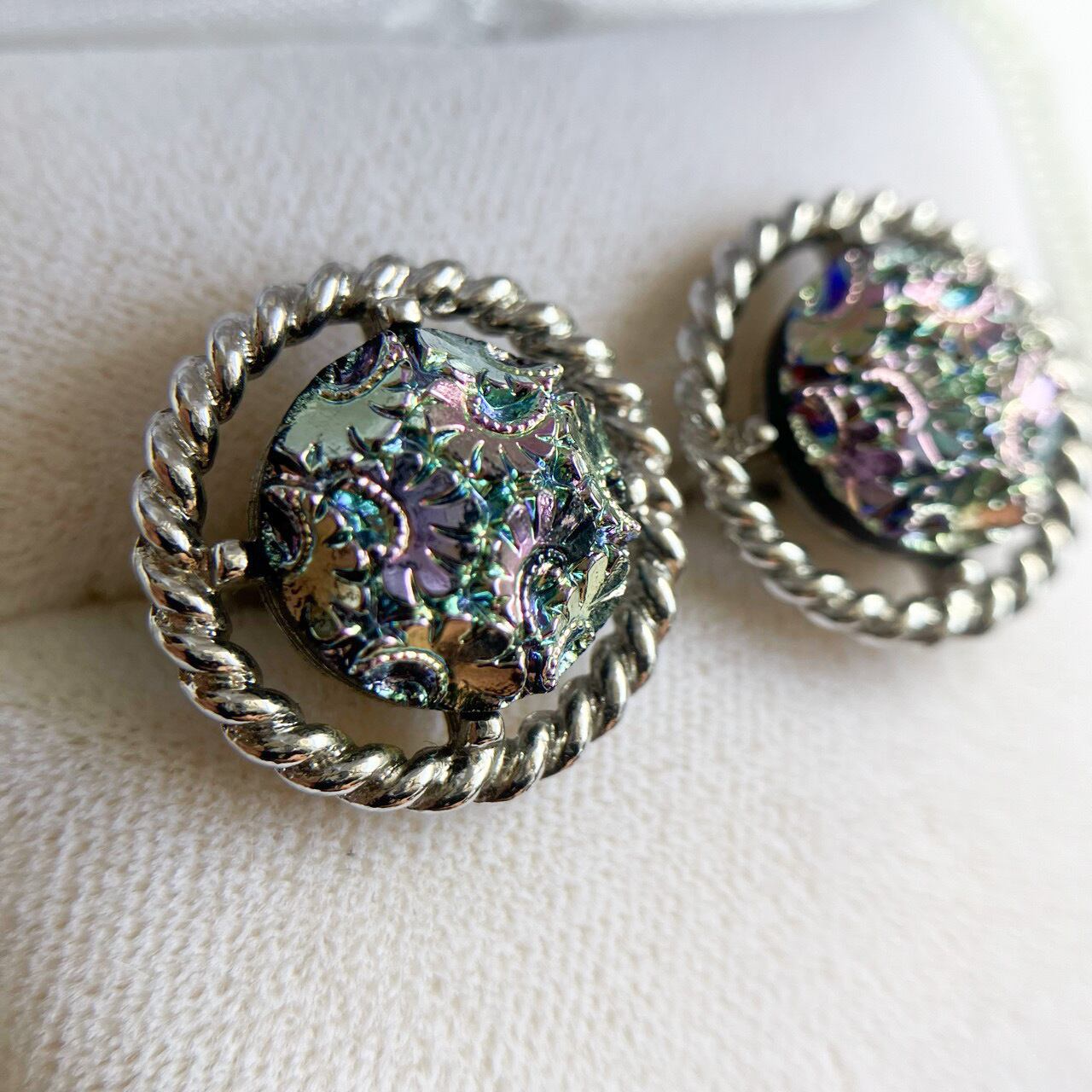 1949年に設立されたジュエリーメーカー"Sarah Coventry"(サラコベントリー)の、シルバーメタルのデザインされたサークル型フレームに、立体的なお花の彫り模様が入ったメタリックオーロラ色に輝くカボションがセットされたスペシャルなデザインが、とても素敵なヴィンテージイヤリングです。