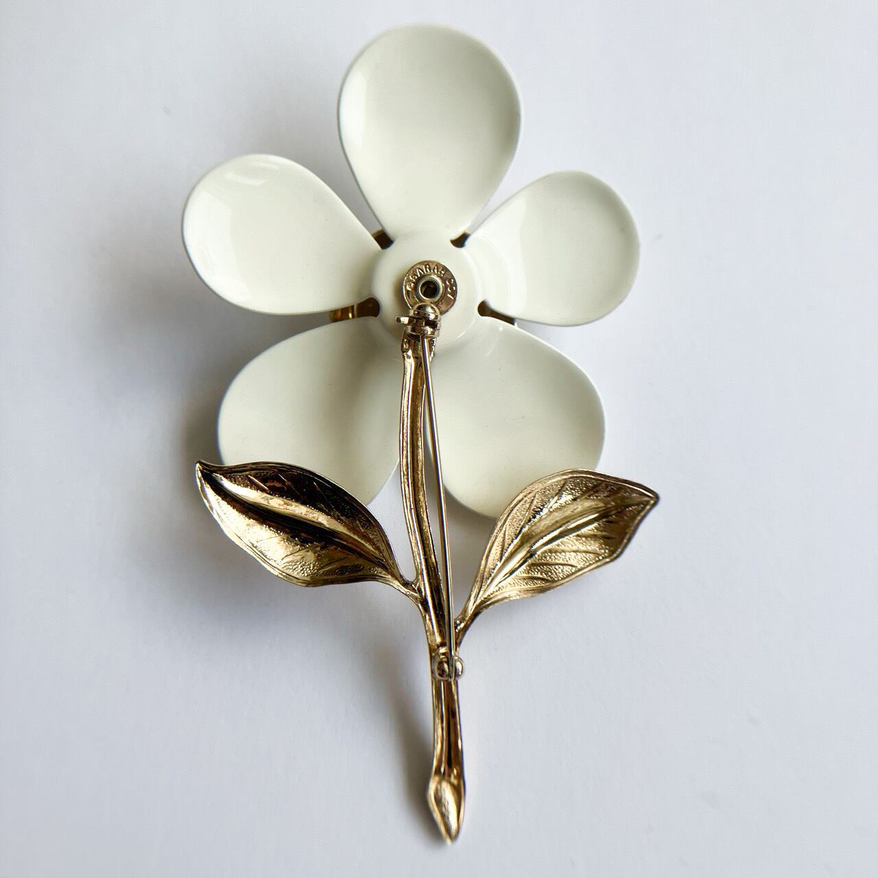 1949年に設立されたジュエリーメーカー”Sarah Coventry”(サラコベントリー)の、ホワイトエナメル&ゴールドメタルのキュートでお洒落なフラワーデザインがとても素敵なヴィンテージブローチです。